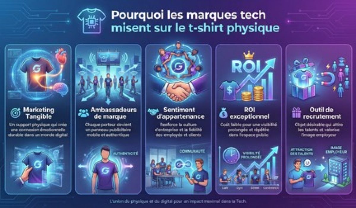 Dans un univers où toutes les marques tech se battent pour capter de l’attention sur les mêmes écrans, avec les mêmes formats publicitaires et souvent les mêmes messages, sortir du numérique devient un acte de différenciation. Un t-shirt bien designé ne se swipe pas. Il ne se bloque pas avec un adblocker. Il ne disparaît pas après quinze secondes.
